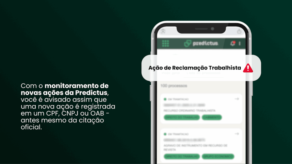 O monitoramento de novas ações da Predictus automatiza esse acompanhamento e envia notificações no exato momento em que um novo processo é distribuído.