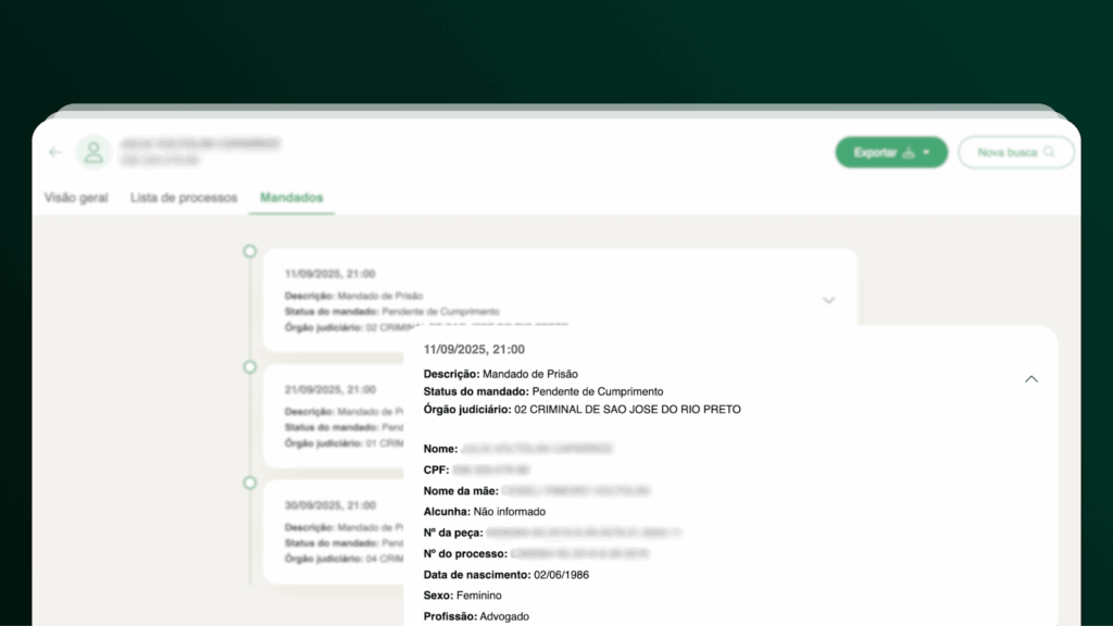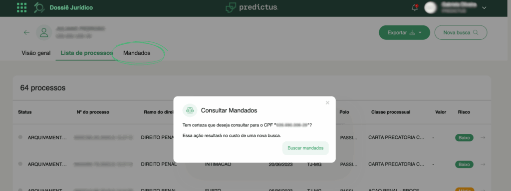 - Realize uma consulta por CPF. Você visualizará a aba “Mandados” ao lado da “Visão Geral”e “Lista de Processos”.
