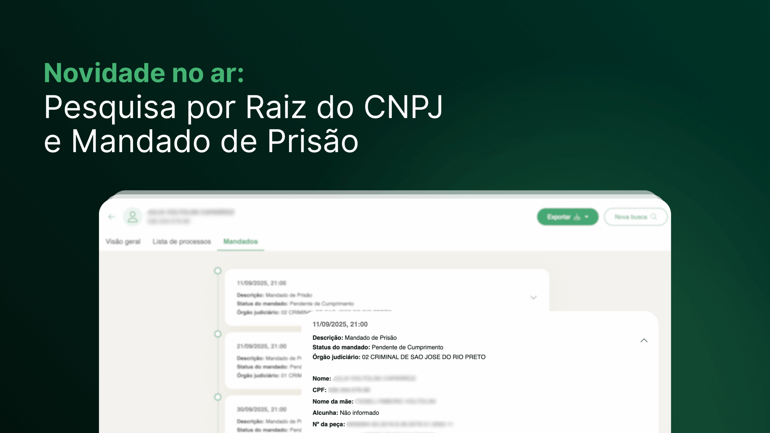 No módulo onde pode ser realizada a consulta por CPF, o Dossiê Jurídico, foi adicionado um dado extremamente sensível e decisivo: a existência de mandado de prisão ativo vinculado àquela pessoa.