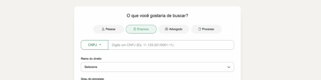 Ele permite consultar o histórico judicial completo de pessoa física, pessoa jurídica ou advogado, a partir de múltiplos critérios como CPF, CNPJ, nome completo ou parcial, número do processo (CNJ/NPU), OAB ou filtros personalizados como valor da causa, assunto, status, tribunal e julgador.