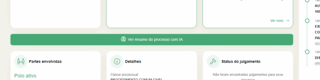 O Resume AI sintetiza informações essenciais do processo, facilitando a compreensão rápida do contexto, especialmente em cenários de alto volume de análise. Ele organiza os pontos centrais de forma resumida, permitindo leitura ágil sem perder a visão estratégica.