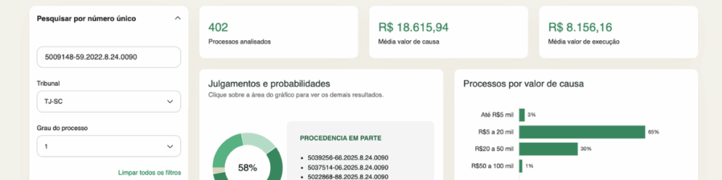 Ao analisar milhares de processos semelhantes, a ferramenta retorna indicadores estatísticos como volume de processos comparáveis, médias de valor da causa, médias de prazo até julgamento, probabilidade percentual de cada tipo de decisão, distribuição histórica por ano e identificação de padrões recorrentes.