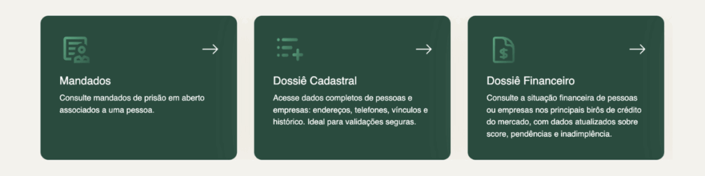 Dossiê financeiro, com dados financeiros provenientes dos principais birôs de crédito do mercado, incluindo score e pendências.